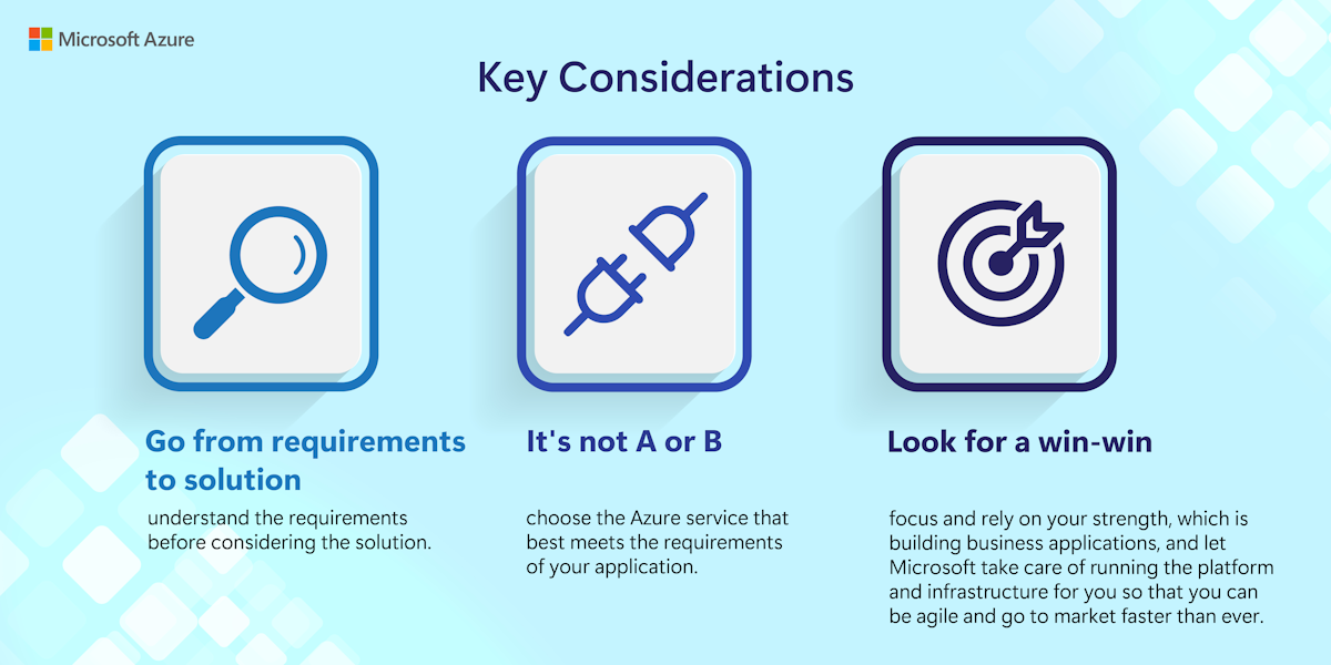 The following diagram summarizes the key considerations for choosing an Azure service for any application: