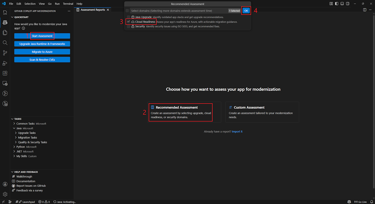 Select Recommended Assessment, select the Cloud Readiness domain, and select OK to start the assessment.