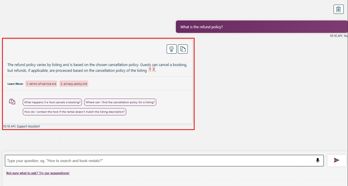The chat app is preloaded with rental information from a markdown file catalog. You can use the chat app to ask questions about the rental process. The following steps walk you through the process of using the chat app.