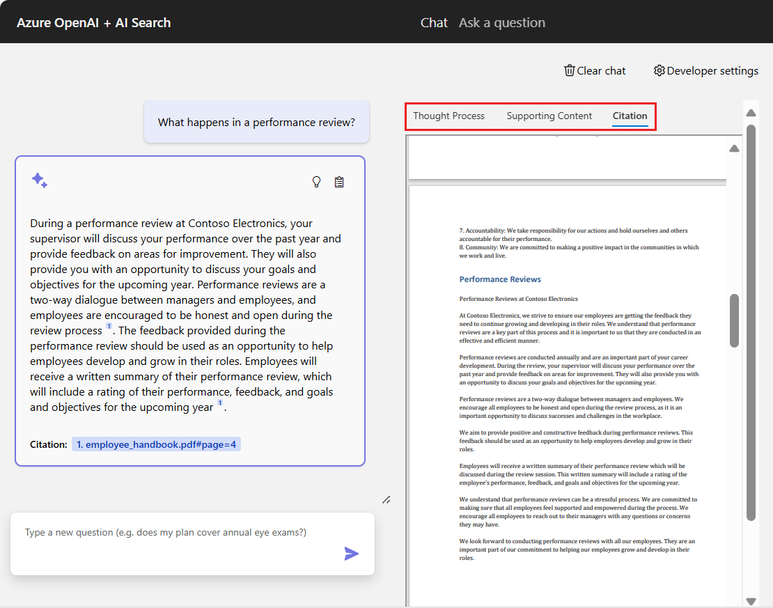 Tab Description Thought Process Displays a script of the question/answer interactions in the chat. You can view the content provided by the chat app system, questions entered by theuser, and clarifications made by the systemassistant.Supporting Content Lists the information used to answer your question and the source material. The number of source material citations is specified by the Developer settings. The default number of citations is 3. Citation Shows the original source contain for the selected citation. When you're done, select the currently selected tab in the right pane. The right pane closes.