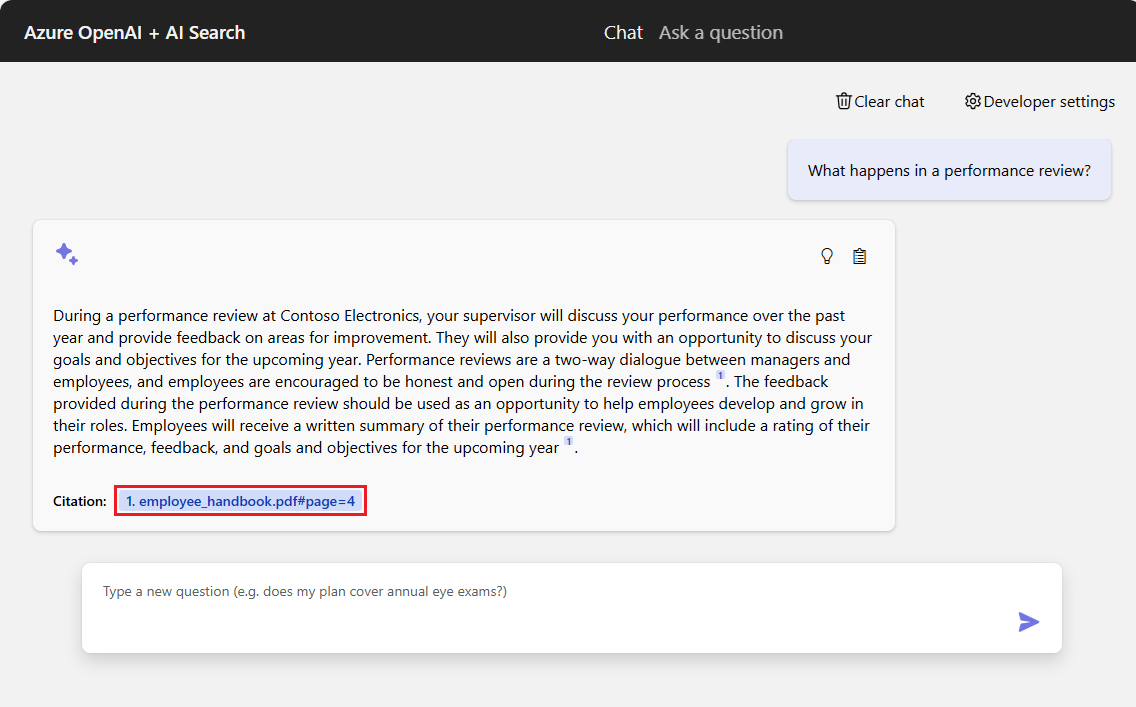The chat app is preloaded with employee benefits information from PDF files. You can use the chat app to ask questions about the benefits. The following steps walk you through the process of using the chat app. Your answers might vary as the underlying models are updated.