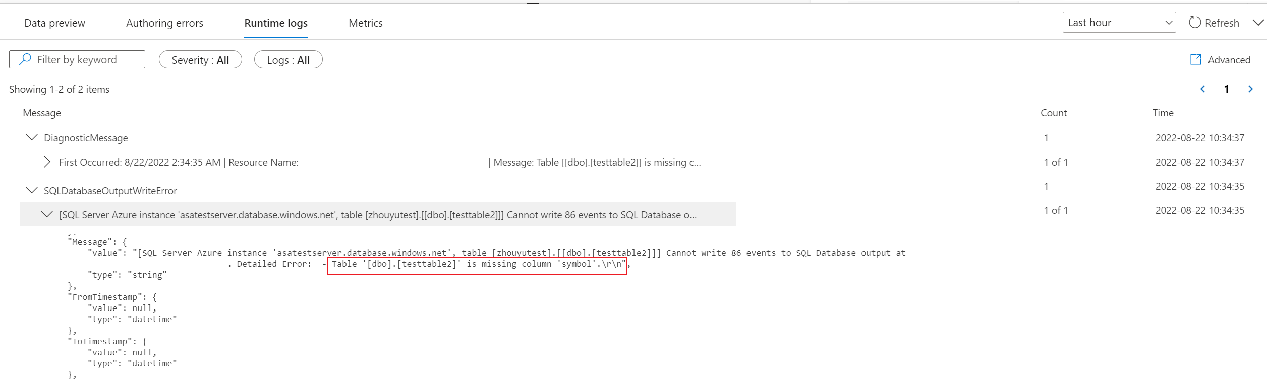 In the following screenshot example, the user has configured SQL Database output with a table schema that doesn't match with the fields of the job output.