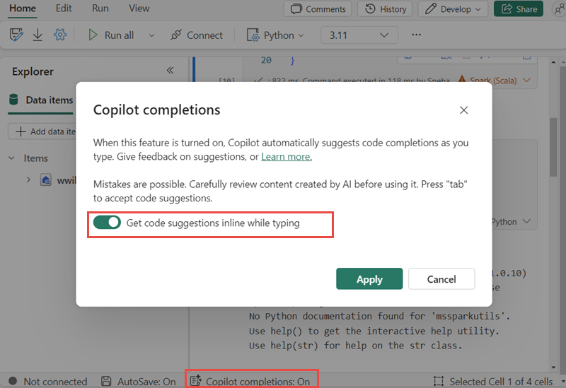 Fuldførelse af indbygget kode i Copilot er en AI-drevet funktion, der hjælper dig med at skrive Python-kode hurtigere og mere effektivt i Fabric Notebooks. Denne funktion indeholder intelligente, kontekstafhængige kodeforslag, når du skriver kode. Det reducerer gentagne opgaver, minimerer syntaksfejl og fremskynder udviklingen ved at integrere problemfrit i din notesbogarbejdsproces.