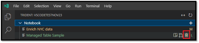 - Ændret: M-tegnet til højre for navnet og den gule tekst angiver, at du har downloadet og redigeret notesbogen lokalt i VS Code og endnu ikke har publiceret disse ventende ændringer tilbage til fjernarbejdsområdet.