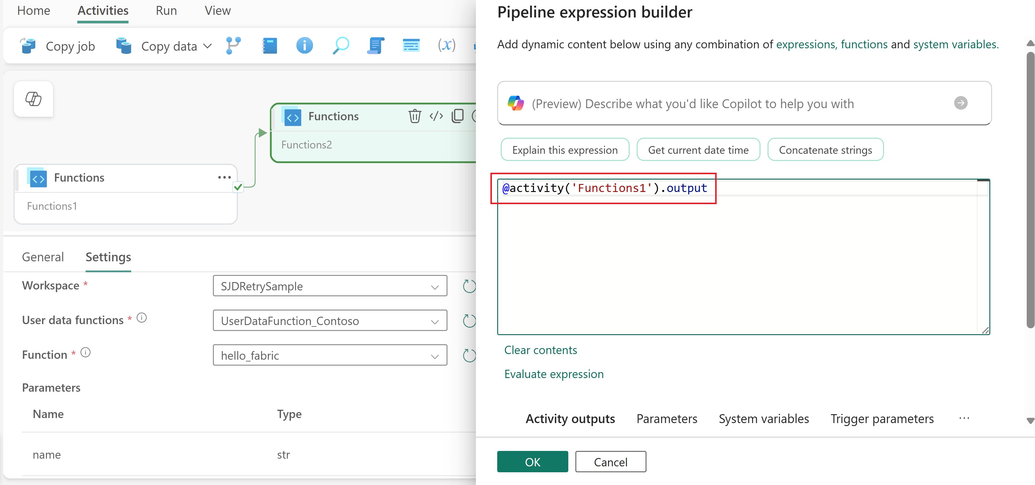 @activity('YourFunctionActivityName').outputtil at referere funktionens returværdi. For eksempel erFunctions1navnet på funktionsaktiviteten , som du kan bruge@activity('Functions1').outputtil at referere til dens output.