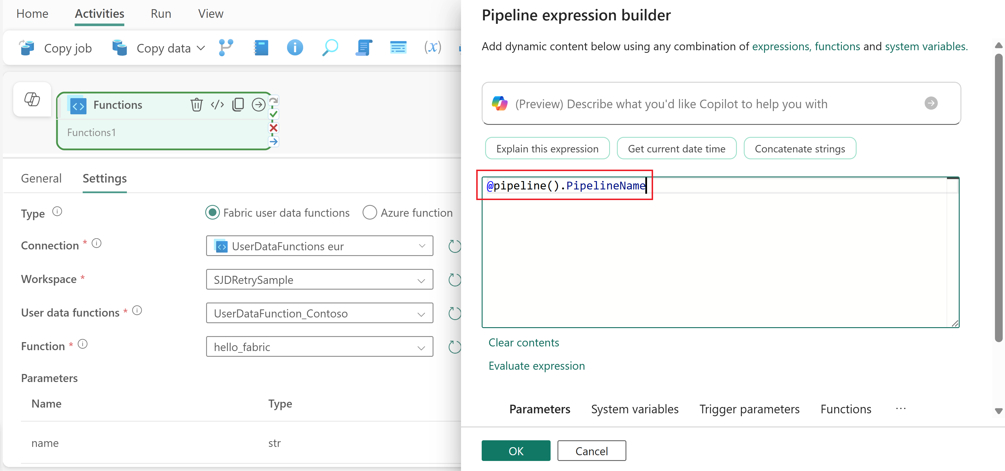 @pipeline().parameters.PipelineNameden til at sende en pipelineparameter til din funktion.