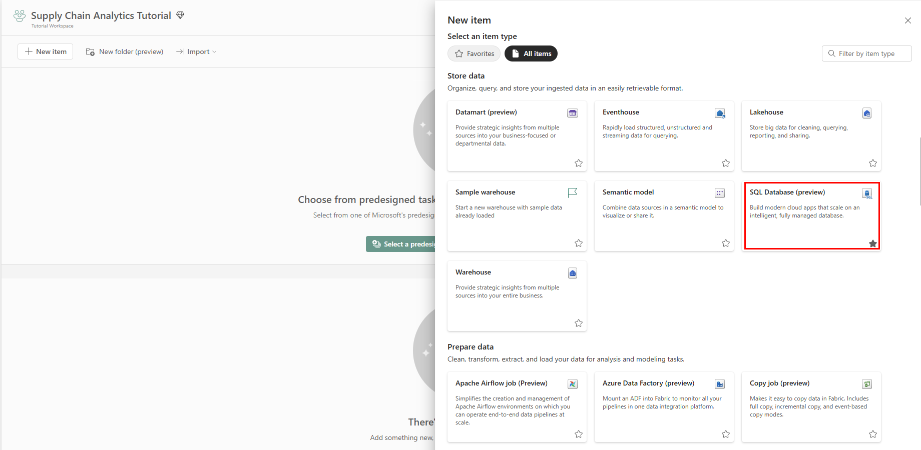 Nu, hvor du har et arbejdsområde, kan du oprette din første SQL-database, som er en af de typer, du kan oprette i Fabric Database.