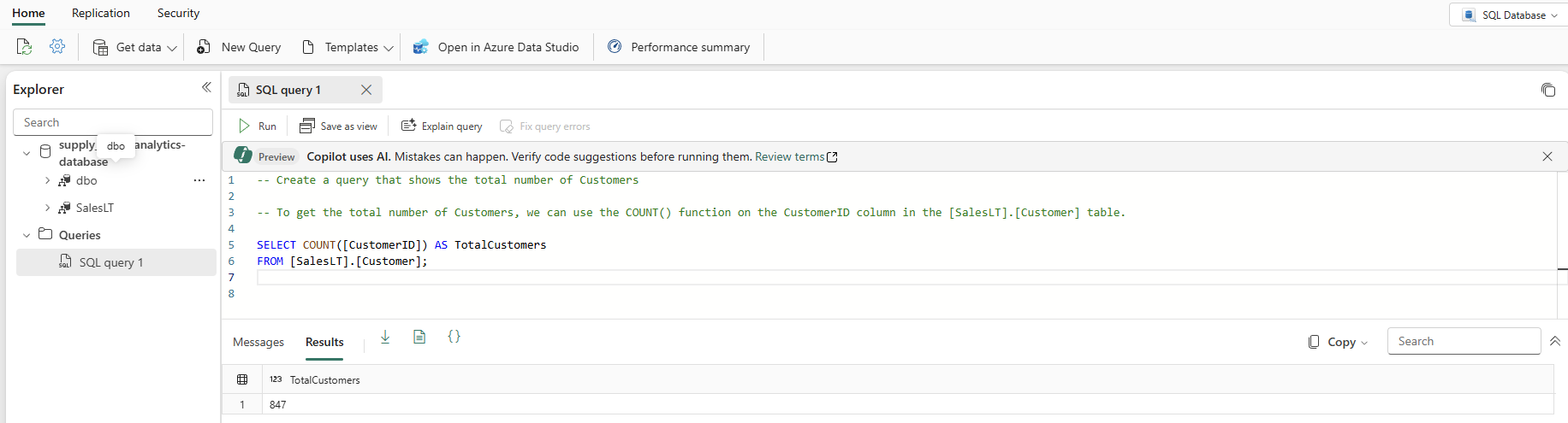 -- Create a query that shows the total number of customers. og tryk på Enter. Du får et resultat, der ligner dette:Hvis du trykker på tabulatortasten, implementeres den foreslåede kode: