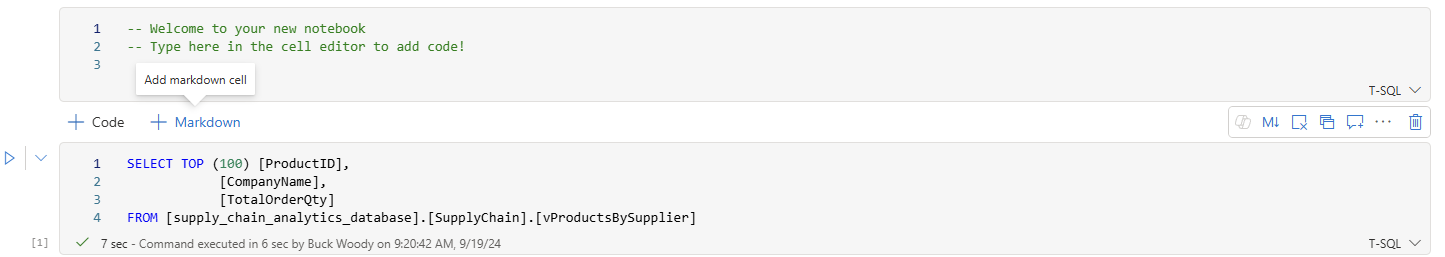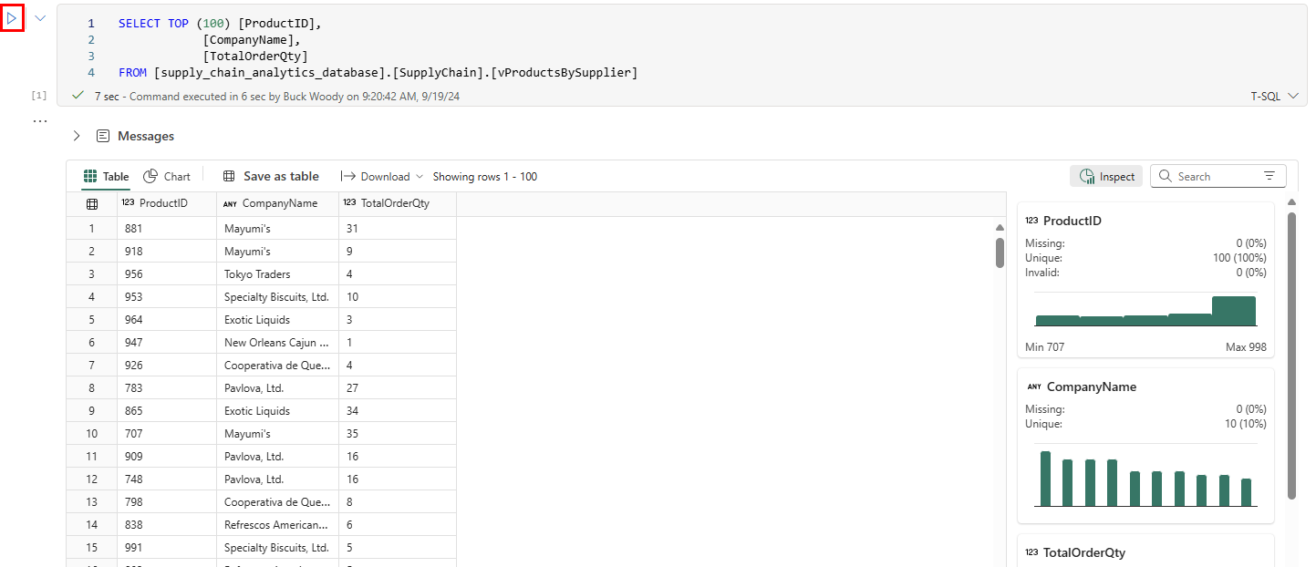 Dette opretter en celle med T-SQL-kode, hvor sætningerne er udfyldt for dig. Vælg knappen Kør celle for den celle, der skal køre forespørgslen, og returner resultaterne.