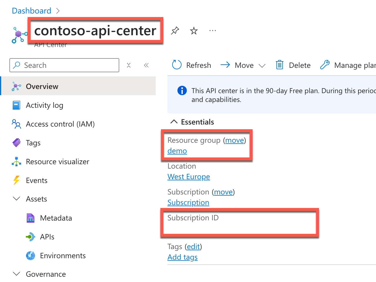 From the Azure API Center instance Overview page, copy the name of the API Center instance, the name of the resource group and the subscription ID. You need this information to configure the ApiCenterMinimalPermissionsPlugin so that it can connect to your Azure API Center instance.