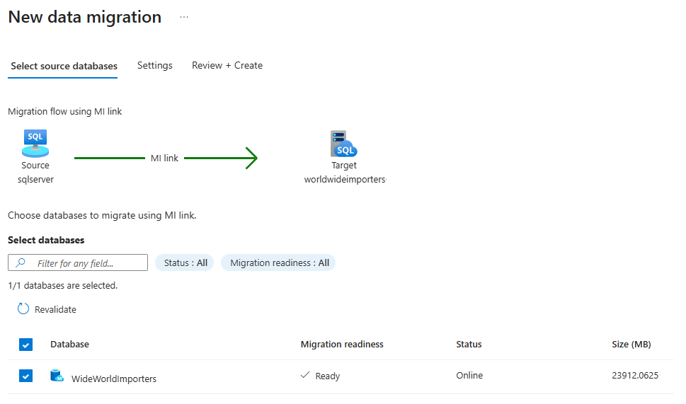 1.1.3348.364or later supports selecting up to 10 databases to migrate simultaneously. If your extension version is earlier, you can only select, and migrate, one database at a time.On the Settings tab, provide the name of the MI link. The name of the availability group is autogenerated - customize it, only if you need to. You can also use Test connection to test the connection to the source SQL Server instance, though be aware that false positives can occur in some network configurations. Use Next: Review + create to proceed to the next page: