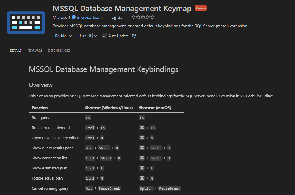 - Install Azure Data Studio-style key bindings through the MSSQL Database Management Keymap companion extension.