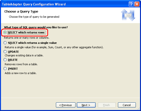 Auf dem in Abbildung 4 dargestellten Bildschirm fragt uns der Assistent, welche Art von Abfrage hinzugefügt werden soll. Da die GetProductsWithPriceQuartile Methode alle Spalten und Datensätze aus der Products Tabelle zurückgibt, wählen Sie die SELECT-Option aus, die die Zeilenoption zurückgibt, und klicken Sie auf "Weiter".