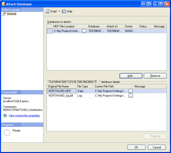 Wir müssen die Northwind-Datenbank im DataFiles-Ordner (oder wo auch immer Sie sie verschoben haben) an die SQL Server 2005 Express Edition-Datenbankinstanz anhängen. Klicken Sie mit der rechten Maustaste auf den Ordner "Datenbanken", und wählen Sie im Kontextmenü die Option "Anfügen" aus. Dadurch wird das Dialogfeld "Datenbanken anfügen" angezeigt. Klicken Sie auf die Schaltfläche "Hinzufügen", führen Sie einen Drilldown zur entsprechenden NORTHWND.MDF Datei aus, und klicken Sie auf "OK". An diesem Punkt sollte ihr Bildschirm ähnlich aussehen wie in Abbildung 2.