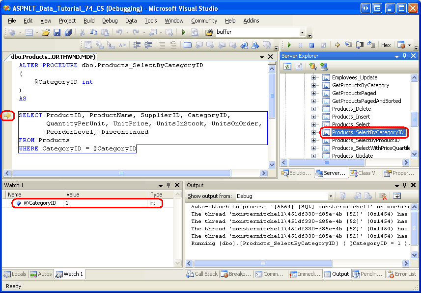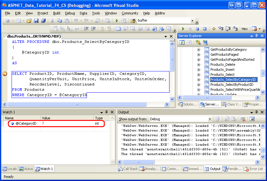 Die Products_SelectByCategoryID gespeicherte Prozedur wurde im Lernprogramm "Using Existing Stored Procedures for Typed DataSets TableAdapters" erstellt. Die entsprechende Webseite (~/AdvancedDAL/ExistingSprocs.aspx) enthält eine GridView, die die von dieser gespeicherten Prozedur zurückgegebenen Ergebnisse anzeigt. Besuchen Sie diese Seite über den Browser. Wenn Sie die Seite erreicht haben, wird der Haltepunkt in der Products_SelectByCategoryID gespeicherten Prozedur erreicht, und die Steuerung wird an Visual Studio zurückgegeben. Genau wie in Schritt 1 können Sie die Anweisungen der gespeicherten Prozedur durchlaufen und die Parameterwerte anzeigen und ändern.