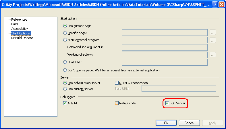 Bevor wir mit dem Debuggen gespeicherter Prozeduren beginnen können, die von der Anwendung aufgerufen werden, müssen wir die ASP.NET Webanwendung anweisen, in den SQL Server-Debugger zu integrieren. Klicken Sie zunächst mit der rechten Maustaste auf den Websitenamen im Projektmappen-Explorer (ASPNET_Data_Tutorial_74_VB). Wählen Sie im Kontextmenü die Option "Eigenschaftenseiten" aus, aktivieren Sie das Element "Startoptionen" auf der linken Seite, und aktivieren Sie das Kontrollkästchen "SQL Server" im Abschnitt "Debuggers" (siehe Abbildung 3).