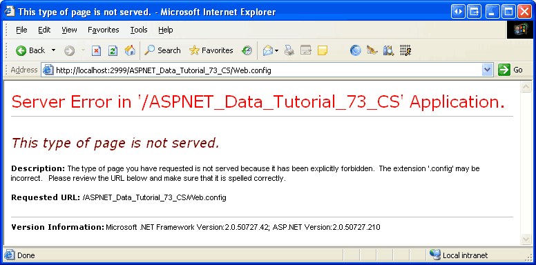 Da Web.config vertrauliche Daten wie Verbindungszeichenfolge enthalten können, ist es wichtig, dass die Inhalte Web.config geschützt und vor nicht autorisierten Betrachtern verborgen bleiben. Standardmäßig wird jede HTTP-Anforderung an eine Datei mit der .config Erweiterung vom Modul ASP.NET behandelt, das die Meldung Dieser Seitentyp wird nicht bereitgestellt, wie in Abbildung 1 gezeigt, zurückgibt. Dies bedeutet, dass Besucher den Inhalt Ihrer Web.config Datei nicht anzeigen können, indem sie einfach http://www.YourServer.com/Web.config in die Adressleiste ihres Browsers eingeben.