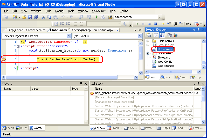 Das ist alles! Beim Starten der Anwendung erfasst die LoadStaticCache() Methode die Lieferanteninformationen aus der BLL und speichert sie in einer statischen Membervariable (oder in dem Cachespeicher, den Sie in der StaticCache Klasse verwendet haben). Um dieses Verhalten zu überprüfen, legen Sie einen Haltepunkt in der Application_Start Methode fest, und führen Sie Ihre Anwendung aus. Beachten Sie, dass der Haltepunkt beim Start der Anwendung ausgelöst wird. Nachfolgende Anforderungen führen jedoch nicht dazu, dass die Application_Start Methode ausgeführt wird.