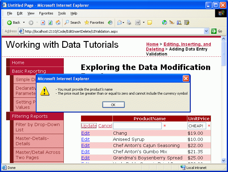 Der UnitPriceEditItemTemplate beinhaltet keinen RequiredFieldValidator, wodurch der Postback erfolgen kann und die Aktualisierungslogik beginnt. Der RowUpdating Ereignishandler, der aus dem Tutorial Untersuchen der mit dem Einfügen, Aktualisieren und Löschen verknüpften Ereignisse kopiert wurde, enthält jedoch eine programmgesteuerte Überprüfung, die sicherstellt, dass UnitPrice bereitgestellt wird. Sie können diese Logik entfernen, sie in der Vorliegenden Form belassen oder ein RequiredFieldValidator zu der UnitPriceEditItemTemplateDatei hinzufügen.