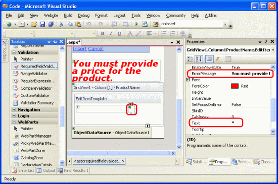 Fügen Sie im ProductNameEditItemTemplate einen RequiredFieldValidator hinzu, indem Sie ihn aus der Toolbox in die Bearbeitungsoberfläche der Vorlage ziehen und nach der TextBox platzieren.