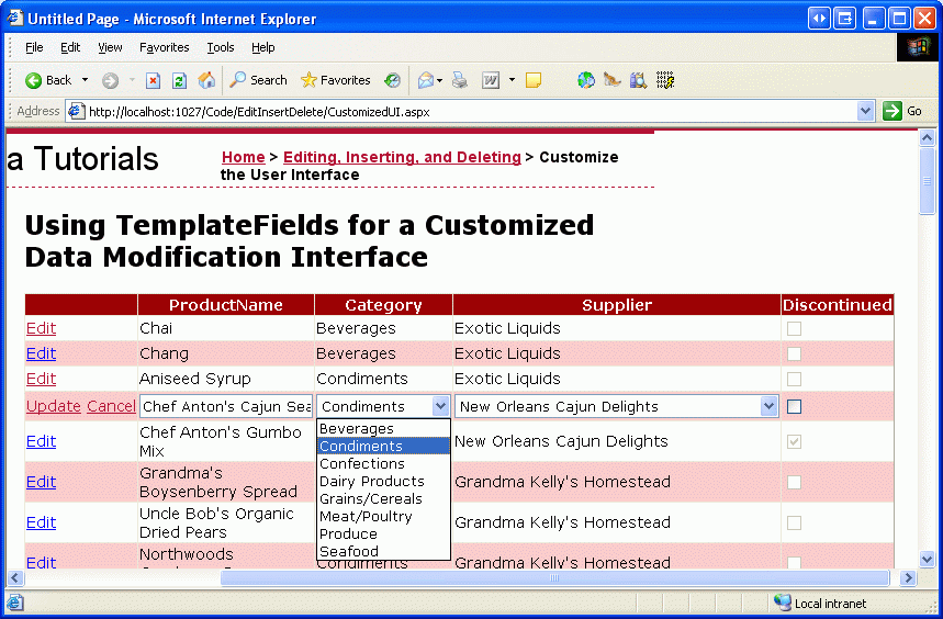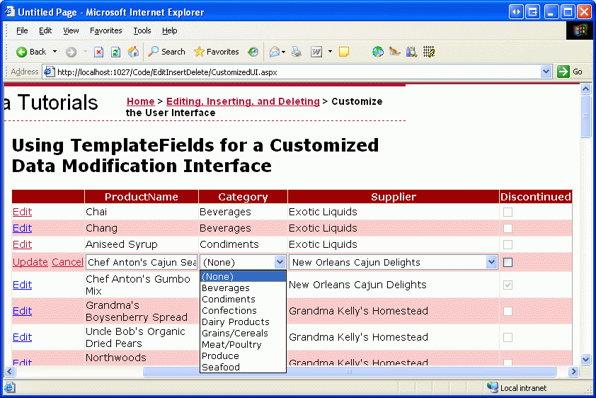 Nachdem die Bindungen auf die SelectedValue Eigenschaften der beiden DropDownLists angewendet wurden, werden die Kategorie- und Lieferantenspalten des bearbeiteten Produkts standardmäßig auf die Werte des aktuellen Produkts gesetzt. Beim Klicken auf "Aktualisieren" werden die CategoryID Werte und SupplierID Werte des ausgewählten Dropdownlistenelements an die UpdateProduct Methode übergeben. Abbildung 11 zeigt das Lernprogramm, nachdem die Datenbindungsanweisungen hinzugefügt wurden; beachten Sie, wie die ausgewählten Dropdownlistenelemente für Chef Antons Cajun Seasoning korrekt condiment und New Orleans Cajun Delights sind.