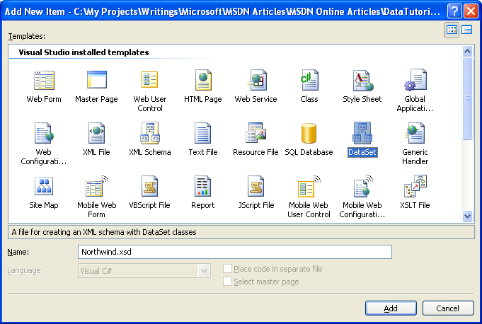 Um mit der Erstellung unseres DAL zu beginnen, fügen wir zunächst ein typisiertes DatenSet zu unserem Projekt ein. Klicken Sie dazu im Projektmappen-Explorer mit der rechten Maustaste auf den Projektknoten, und wählen Sie "Neues Element hinzufügen" aus. Wählen Sie die DataSet-Option aus der Liste der Vorlagen aus, und nennen Sie sie Northwind.xsd.