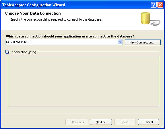 Der Konfigurations-Assistent für TableAdapter beginnt, indem Sie aufgefordert werden, auszuwählen, mit welcher Datenbank sie arbeiten soll. In der Dropdownliste werden diese Datenbanken im Server-Explorer angezeigt. Wenn Sie die Northwind-Datenbank nicht zum Server-Explorer hinzugefügt haben, können Sie zu diesem Zeitpunkt auf die Schaltfläche "Neue Verbindung" klicken.