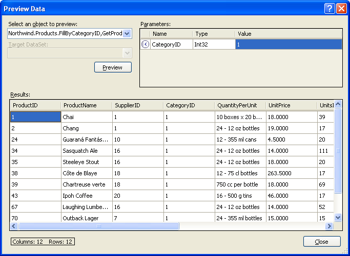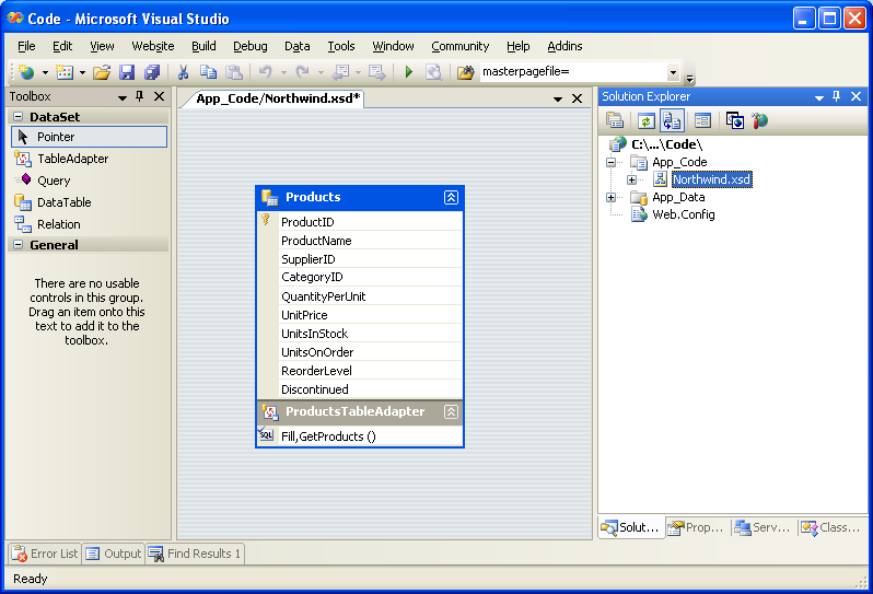 Zu diesem Zeitpunkt verfügen wir über ein typisiertes DataSet mit einer einzelnen DataTable (Northwind.Products) und einer stark typisierten DataAdapter-Klasse (NorthwindTableAdapters.ProductsTableAdapter), die über eine Methode GetProducts() verfügt. Diese Objekte können verwendet werden, um auf eine Liste aller Produkte aus Code zuzugreifen, z. B.: