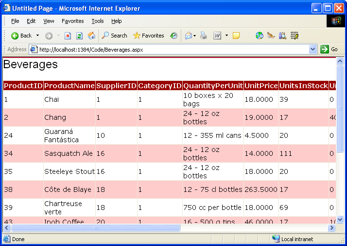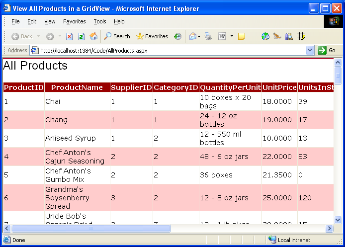Jedes objekt, das in diesem Beispiel verwendet wird, ist ebenfalls stark typiert, sodass Visual Studio IntelliSense und kompilierte Typüberprüfung bereitstellen kann. Und das Beste ist, dass alle vom TableAdapter zurückgegebenen DataTables mit ASP.NET-Datenwebsteuerelementen gebunden werden können, wie zum Beispiel GridView, DetailsView, DropDownList, CheckBoxList und mehrere andere. Im folgenden Beispiel wird veranschaulicht, wie die Von der GetProducts() Methode zurückgegebene DataTable in nur drei Codezeilen innerhalb des Page_Load Ereignishandlers an eine GridView gebunden wird.