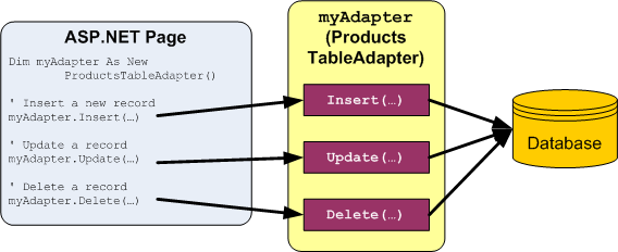 Beachten Sie, dass stark typierte DataTables keine Informationen zum Zugreifen auf Daten aus der zugrunde liegenden Datenbanktabelle enthalten. Um die Daten zum Auffüllen der DataTable abzurufen, verwenden wir eine TableAdapter-Klasse, die als Datenzugriffsschicht fungiert. Für unsere Products DataTable enthält das TableAdapter die Methoden GetProducts(), GetProductByCategoryID(categoryID)usw., die wir über die Präsentationsebene aufrufen. Die Rolle der DataTable besteht darin, als stark typierte Objekte zu dienen, die zum Übergeben von Daten zwischen den Ebenen verwendet werden.
