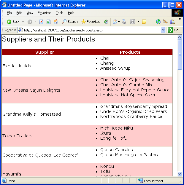 GetProducts()Methode für jeden Lieferanten zurückgegebenen Ergebnisse gebunden ist.