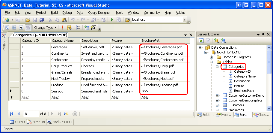 Im Download dieses Lernprogramms finden Sie sieben PDF-Broschürendateien im ~/Brochures Ordner, eine für jede der Kategorien außer Meeresfrüchten. Ich habe absichtlich keine Meeresfrüchte-Broschüre hinzugefügt, um zu veranschaulichen, wie Szenarien behandelt werden, in denen nicht alle Datensätze Binärdaten zugeordnet haben. Um die Tabelle mit diesen Werten zu aktualisieren, klicken Sie im Server-Explorer mit der Categories rechten Maustaste auf den Categories Knoten, und wählen Sie "Tabellendaten anzeigen" aus. Geben Sie dann die virtuellen Pfade zu den Broschürendateien für jede Kategorie ein, die eine Broschüre enthält, wie in Abbildung 1 dargestellt. Da es keine Broschüre für die Kategorie "Meeresfrüchte" gibt, behalten Sie den Wert der BrochurePath Spalte als NULL.
