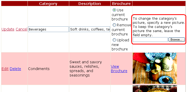 Mit diesem Code können Sie eine Kategorie bearbeiten und die aktuelle Broschüre verwenden, keine Broschüre verwenden oder eine neue hochladen. Fahren Sie fort, und probieren Sie es aus. Legen Sie Haltepunkte in den RowUpdating Und RowUpdated Ereignishandlern fest, um einen Eindruck vom Workflow zu erhalten.