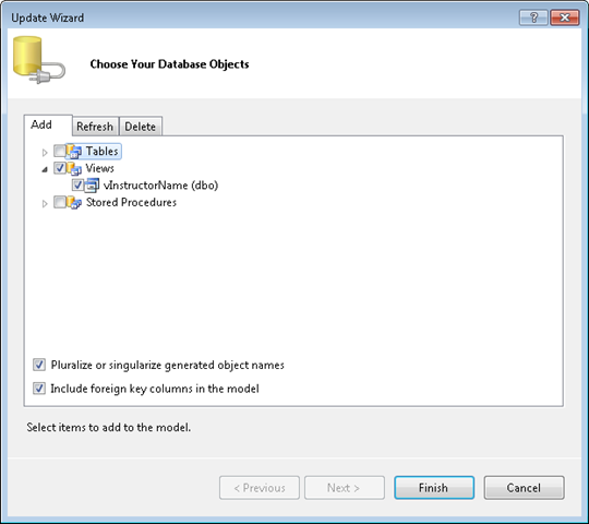 Wenn Sie sich im Code auf die neue vInstructorName Entität beziehen, wollen Sie nicht die Datenbankkonvention verwenden, bei der ein Kleinbuchstabe "v" vorangestellt wird. Daher benennen Sie die Entität und den Entitätensatz im Modell um.