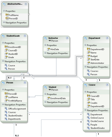 Im Designer sehen Sie, dass das Tool eine vInstructorName Entität und eine neue Zuordnung zwischen der Department und der Person Entität erstellt hat.