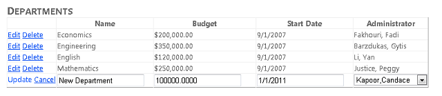 Der Handler für das Init Ereignis speichert einen Verweis auf das DropDownList Steuerelement im Klassenfeld. Der Handler für das RowUpdating Ereignis verwendet den Verweis, um den Wert abzurufen, den der Benutzer eingegeben hat, und wendet ihn auf die Administrator Eigenschaft der Department Entität an.