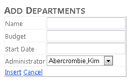 Dieses Markup erstellt zwei ObjectDataSource Steuerelemente, eines zum Einfügen neuer Department Entitäten und eines zum Abrufen von Kursleiternamen für das Steuerelement, das für die DropDownList Auswahl von Abteilungsadministratoren verwendet wird. Das Markup erstellt ein DetailsView Steuerelement für die Eingabe neuer Abteilungen und gibt einen Handler für das Steuerelementereignis ItemInserting an, sodass Sie den Administrator Fremdschlüsselwert festlegen können. Am Ende ist ein ValidationSummary Steuerelement zum Anzeigen von Fehlermeldungen.