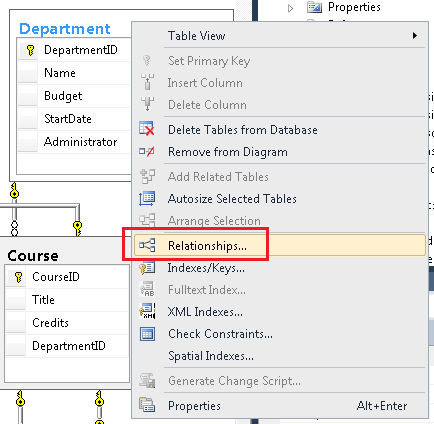 Klicken Sie im Datenbankdiagramm mit der rechten Maustaste auf die Department Tabelle, und wählen Sie "Beziehungen" aus.