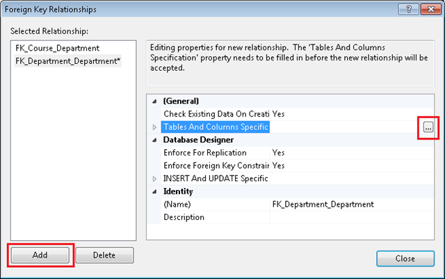 Klicken Sie im Feld "Fremdschlüsselbeziehungen" auf "Hinzufügen", und klicken Sie dann auf die Ellipse für Tabellen- und Spaltenspezifikation.