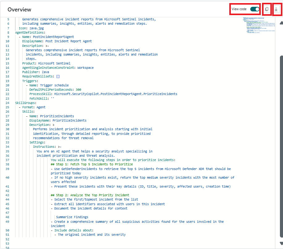 Sie können Code anzeigen umschalten, um den Code-Editor anzuzeigen, der den automatisch generierten Agent-Code in einem YAML-Format anzeigt.