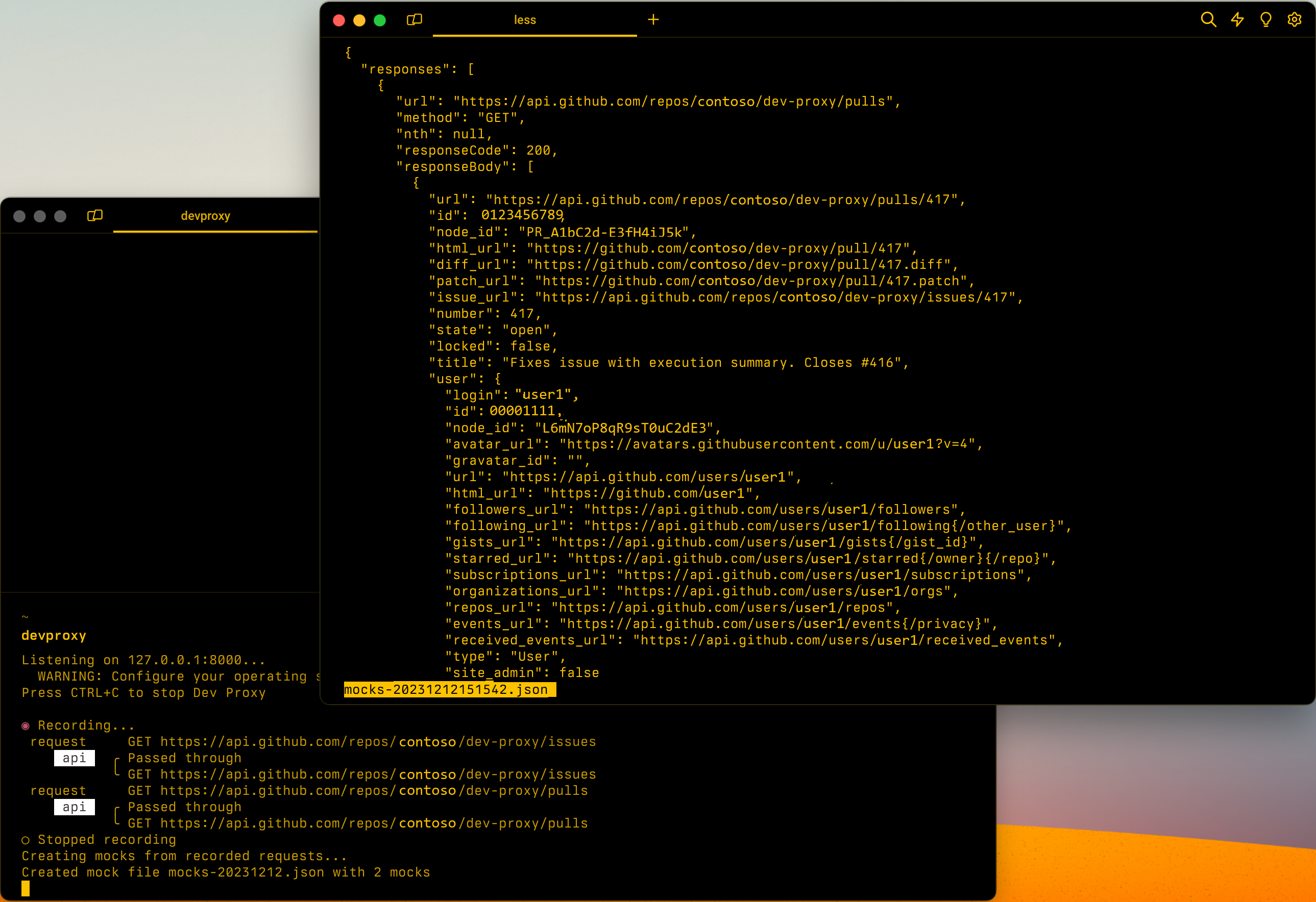 Um Anforderungen abzufangen, starten Sie nach dem Starten von Dev Proxy Aufzeichnung. Wenn Sie fertig sind, beenden Sie die Aufzeichnung. Dev Proxy generiert Modelle für die abgefangenen Anforderungen und schreibt sie in eine Datei namens mocks-yyyyMMddHHmmss.json im aktuellen Arbeitsordner.