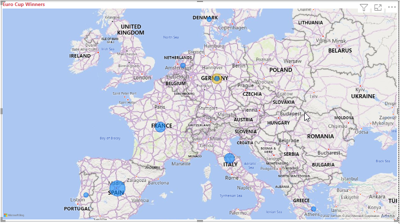Die Karte zeigt für alle Länder/Regionen, die den Europapokal gewonnen haben, identische Datenpunkte. Um die Größe der Datenpunkte so anzupassen, dass sie angeben, wie häufig ein Land/eine Region gewonnen hat, ziehen Sie das Feld Jahr im unteren Teil des Bereichs Visualisierungen auf Datenfelder hier hinzufügen (unter Blasengröße). Das Feld ändert sich automatisch in den Messwert Count of Year, und die Kartenvisualisierung zeigt jetzt größere Datenpunkte für Länder/Regionen, die das Turnier häufiger gewonnen haben.