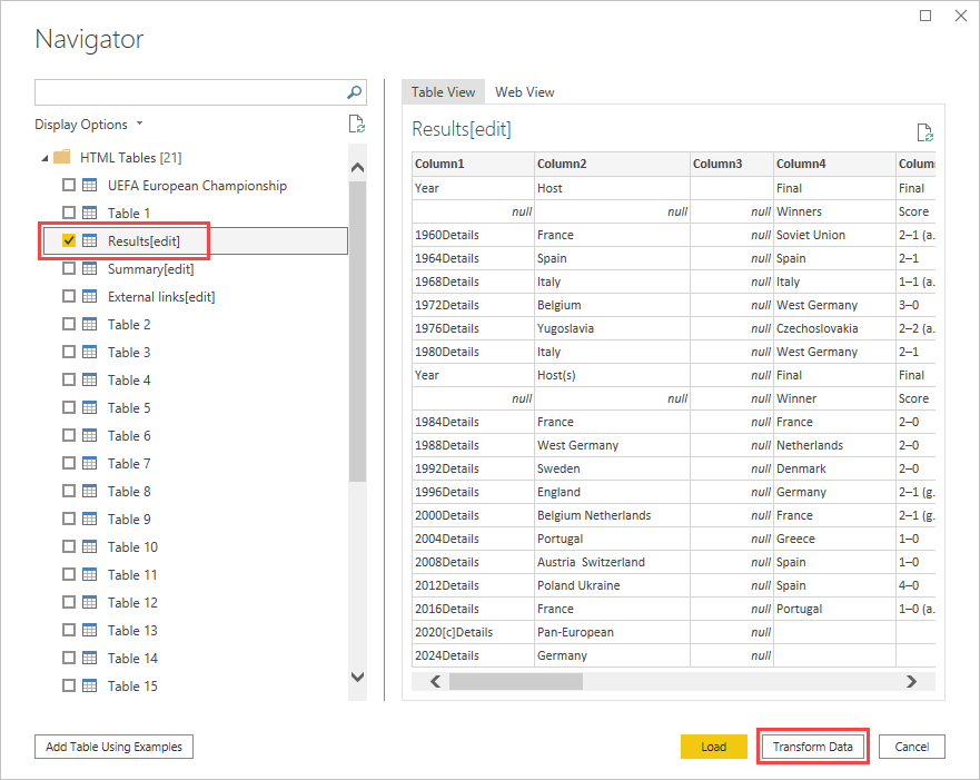 Als langjähriger Fußballfan möchten Sie über die Gewinner der UEFA-Europameisterschaft (Euro Cup) der vergangenen Jahre berichten. Mit Power BI Desktop können Sie diese Daten von einer Webseite in einen Bericht importieren und Visualisierungen erstellen, um die Daten anzuzeigen. In diesem Tutorial erfahren Sie, wie Sie Power BI Desktop für Folgendes verwenden: