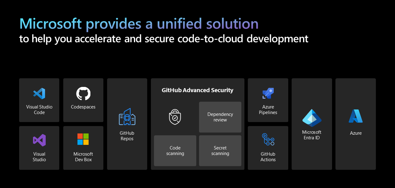 Die einheitliche Lösung von Microsoft, die im folgenden Diagramm veranschaulicht wird, schlägt eine Brücke zwischen DevOps- und SecOps-Teams, die Ihnen helfen, die Entwicklung von Code zu Cloud zu beschleunigen und zu sichern.