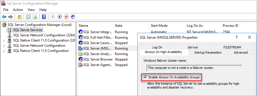 Nachdem Sie hadr aktiviert haben, starten Sie die SQL Server-Instanz neu: