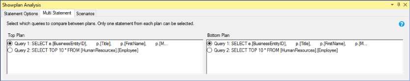 ProdDBundTestDB. Dieses Verhalten kann mit der Option Datenbanknamen beim Vergleichen von Operatoren ignorieren geändert werden.Die Registerkarte Mehrere Anweisungen ist beim Vergleichen von Plänen mit mehreren Anweisungen nützlich, weil sie erlaubt, dass das richtige Anweisungspaar verglichen wird.