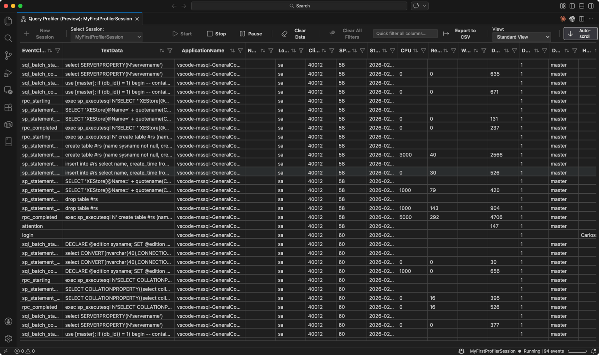 Der Query Profiler in der MSSQL-Erweiterung für Visual Studio Code erfasst und überwacht die Datenbankaktivitäten in Echtzeit mithilfe erweiterter Ereignisse. Sie können live T-SQL-Aktivitäten beobachten, langsame Vorgänge identifizieren und Leistungsengpässe während der Entwicklung finden.