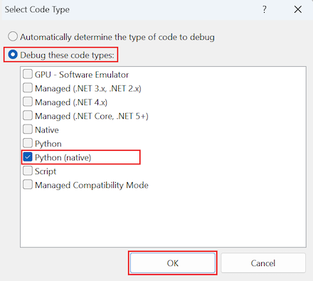 Wählen Sie im Dialogfeld " Codetyp auswählen " die Option " Diese Codetypen debuggen " aus.