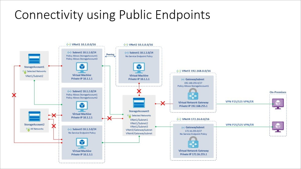 For on-premises access, you can use service endpoints with ExpressRoute, point-to-site, and site-to-site VPNs. We recommend using a private endpoint because it's more secure.