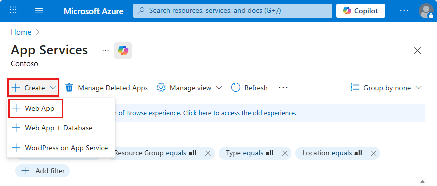 3. Select Create > Web App. You can also navigate to Create Web App directly.